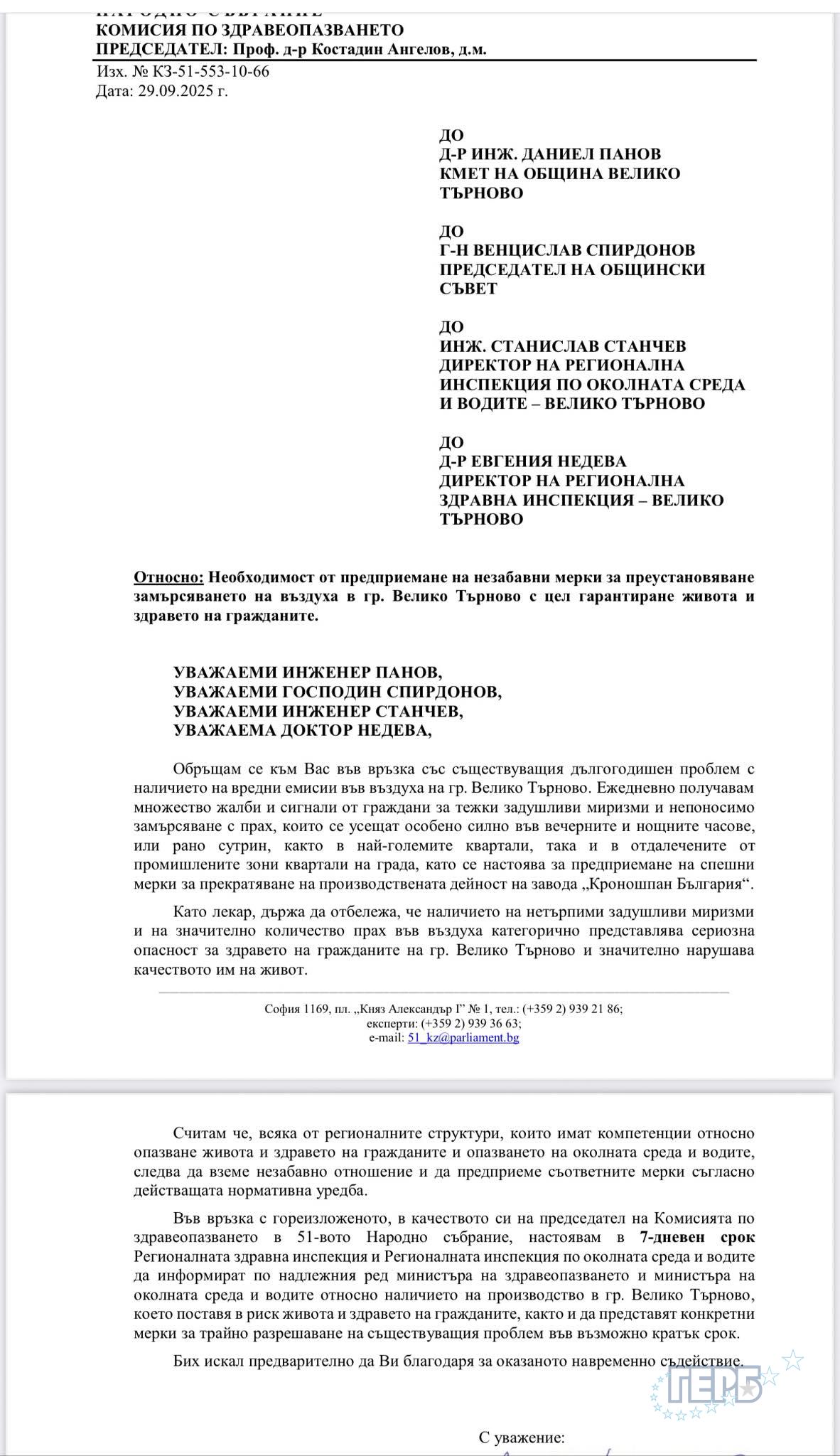 Председателят на Комисията по здравеопазване в 51-вото Народно събрание и народен представител от ГЕРБ-СДС от Велико Търново проф. д-р Костадин Ангелов настоя за спешни и незабавни мерки срещу производствената дейност, която замърсява въздуха и застрашава здравето на хората в старата столица.