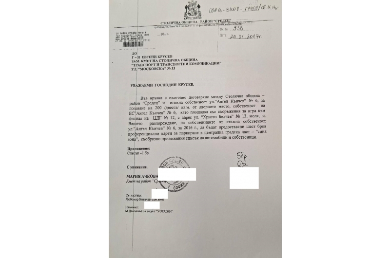 Издаването на 6 броя карти за паркиране на адрес ул. „Ангел Кънчев“ №6 е въз основа на искане от кмета на район „Средец“ (в годините г-жа Мария Ачкова и г-н Трайчо Трайков). Искането е въз основа на договор, сключен от район „Средец“, съгласно който етажната собственост на ул. „Ангел Кънчев“ №6 осигурява 200 кв. дворно място за площадка за игра към детска градина №12 срещу получаването на 6 карти за паркиране за конкретни автомобили, посочени с регистрационни номера.