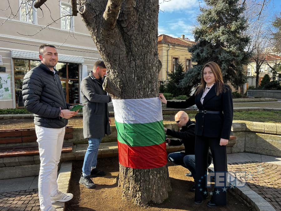 Младежи от МГЕРБ - Сливен украсиха с националното знаме дърветата по главната улица на града. Инициативата на мл ...